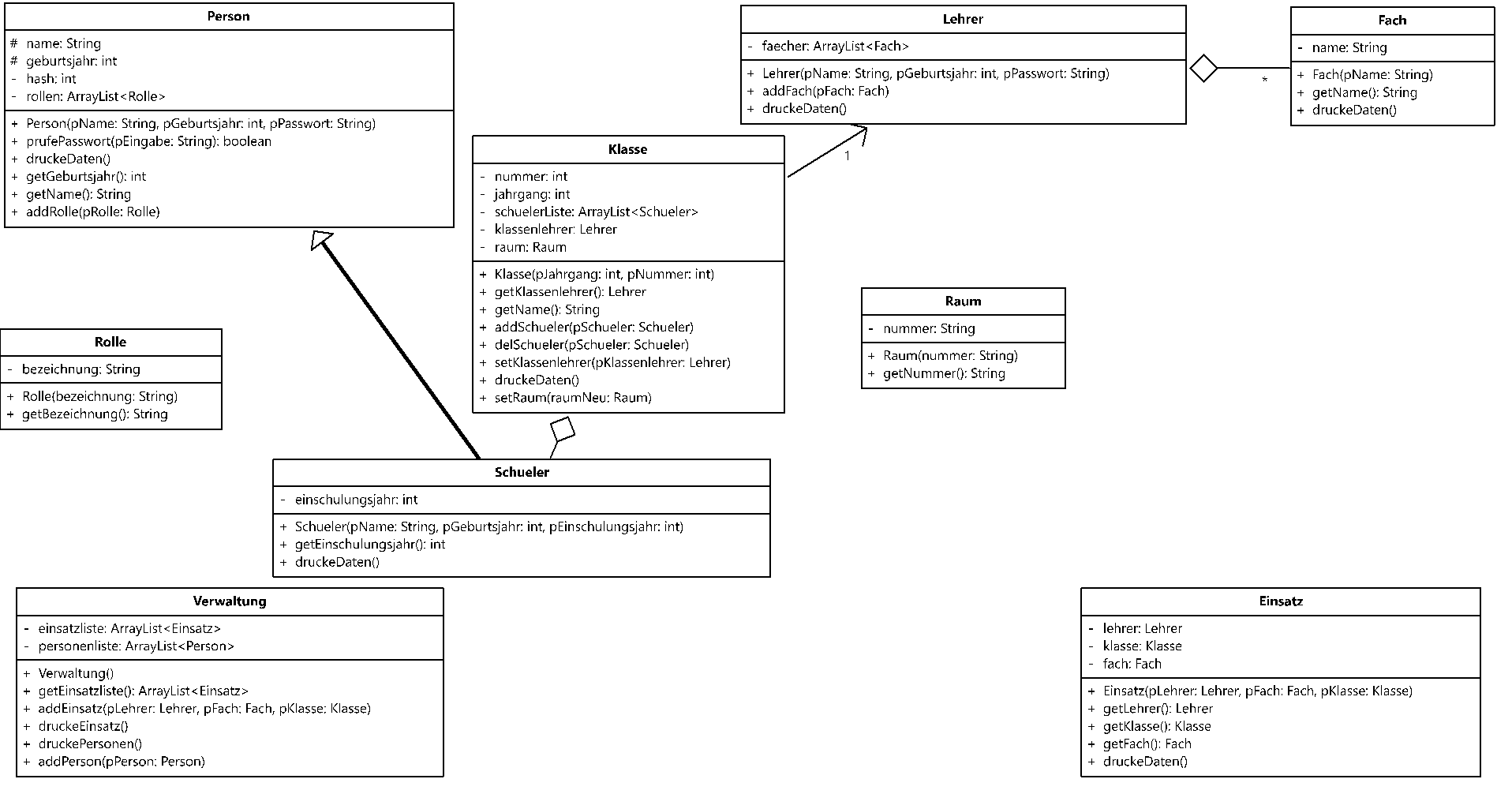 Wir wollen uns nun die Beziehungen etwas genauer anschauen. Das neue Projekt simuliert eine Einsatzplanung an einer Schule. Es liegt als unvollständiges BlueJ-Projekt vor. Die Abbildung zeigt ein Klassendiagramm.